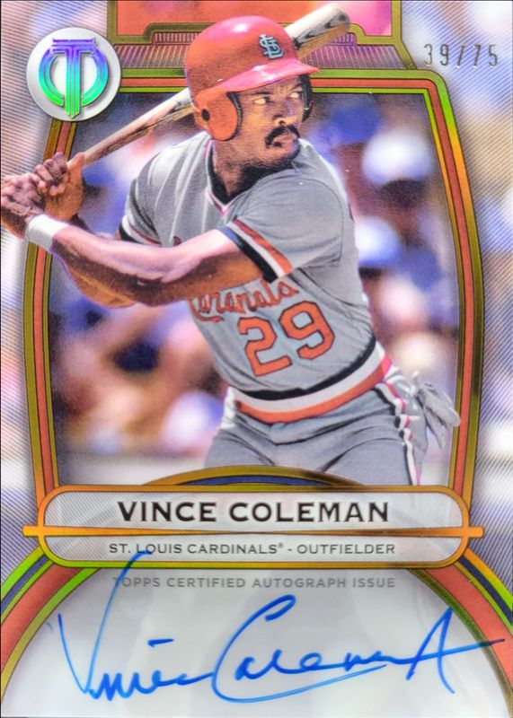 The Vince Coleman 2025 Topps Tribute #TA-VC Tribute Autograph - Gold /75 card is 1 of 12 Vince Coleman's card variations in the 2025 Topps Tribute set being tracked by Sports Card Investor, including Tribute Autograph /199, Tribute Autograph - Blue /150, Tribute Autograph - Green /99, Tribute Autograph - Purple /50, and Tribute Autograph - Orange /25.