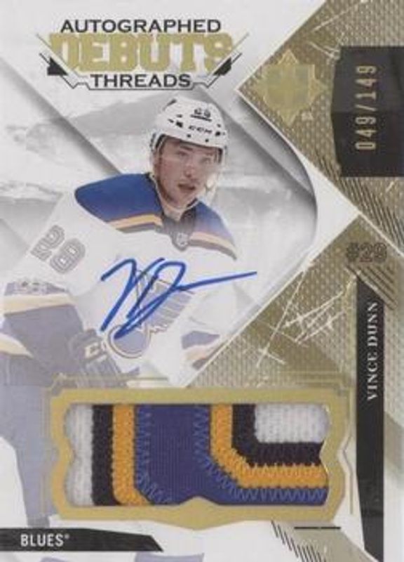 The Vince Dunn 2017 Upper Deck Ultimate Collection #DTA-VD Debut Threads Patch Auto /149 Rookie card is 1 of 14 Vince Dunn's card variations in the 2017 Upper Deck Ultimate Collection set being tracked by Sports Card Investor, including Base /99, Auto Patch /10, Shield Patch /1, Ultimate Introductions, and Ultimate Rookies Jersey /299.