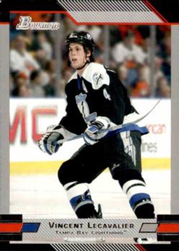 The Vincent Lecavalier 2003 Bowman Draft Picks & Prospects #4 Base card is 1 of 6 Vincent Lecavalier's card variations in the 2003 Bowman Draft Picks & Prospects set being tracked by Sports Card Investor, including Gold, Chrome Refractor /300, Chrome /250, Chrome X-Fractor /150, and Chrome Gold Refractor /50.