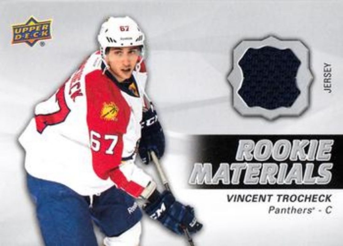 The Vincent Trocheck 2014 Upper Deck #RM28 Rookie Materials card is 1 of 10 Vincent Trocheck's card variations in the 2014 Upper Deck set being tracked by Sports Card Investor, including Young Guns Base, Young Guns - Acetate, Young Guns - UD Exclusives /100, Young Guns - UD High Gloss /10, and Printing Plates Black /1.