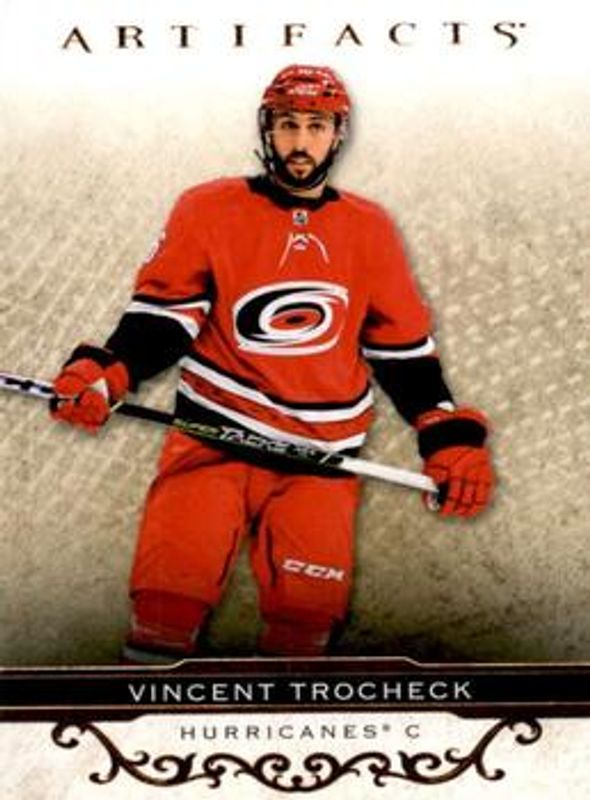 The Vincent Trocheck 2021 Upper Deck Artifacts #32 Rose Gold card is 1 of 18 Vincent Trocheck's card variations in the 2021 Upper Deck Artifacts set being tracked by Sports Card Investor, including Base /999, Neon Green, Turquoise, Ruby /499, and Silver Spectrum /299.