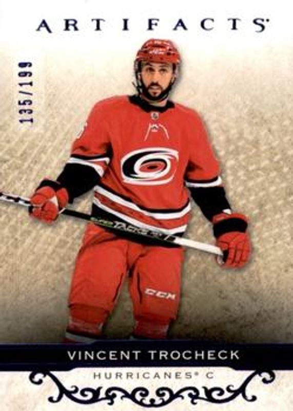 The Vincent Trocheck 2021 Upper Deck Artifacts #32 Royal Blue /199 card is 1 of 18 Vincent Trocheck's card variations in the 2021 Upper Deck Artifacts set being tracked by Sports Card Investor, including Base /999, Neon Green, Rose Gold, Turquoise, and Ruby /499.