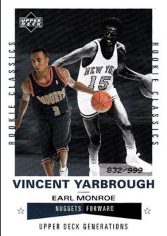 The Vincent Yarbrough 2002 Upper Deck Generations #224 Base /999 Rookie card is 1 of 2 Vincent Yarbrough's card variations in the 2002 Upper Deck Generations set being tracked by Sports Card Investor, including Base /999.