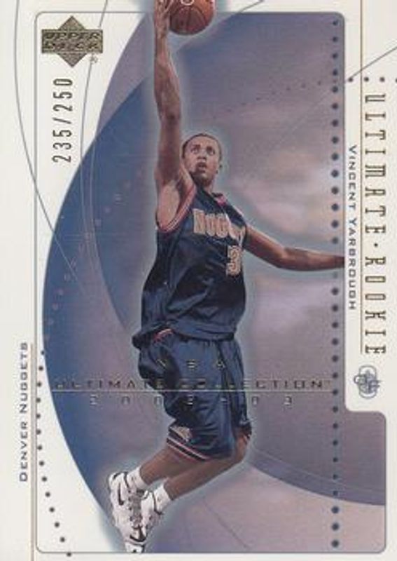 The Vincent Yarbrough 2002 Upper Deck Ultimate Collection #87 Base /250 Rookie card is 1 of 5 Vincent Yarbrough's card variations in the 2002 Upper Deck Ultimate Collection set being tracked by Sports Card Investor, including Ultimate Parallel /25, Game Jersey Patch /50, Jerseys Patches Silver /15, and Jerseys Patches Gold /10.