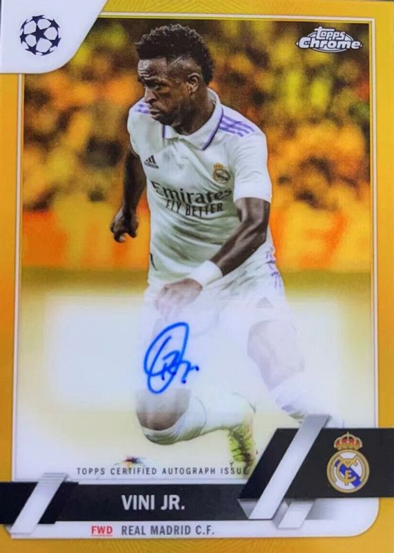 The Vinicius Jr. 2022 Topps Chrome UEFA Club Competitions #CA-V Autographs - Gold Refractor /50 card in Raw condition has not changed in price in the last 30 days and was last sold for $137.50 .