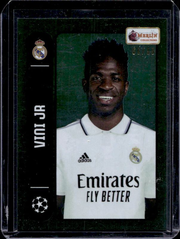 The Vinicius Jr. 2022 Topps Merlin Heritage '98 UEFA Champions League #45 Green /99 card is 1 of 20 Vinicius Jr.'s card variations in the 2022 Topps Merlin Heritage '98 UEFA Champions League set being tracked by Sports Card Investor, including #152 Base, #45 Base, #152 Green /99, #45 Blue /49, and #152 Blue /49.