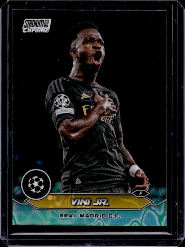 The Vinicius Jr. 2023 Topps Stadium Club Chrome UEFA Champions League #71 Aqua Green Electric Charge /199 card is 1 of 44 Vinicius Jr.'s card variations in the 2023 Topps Stadium Club Chrome UEFA Champions League set being tracked by Sports Card Investor, including Base, Members Only Refractor, Pink Red Electric Charge Refractor, Refractor, and Black & White Refractor /299.