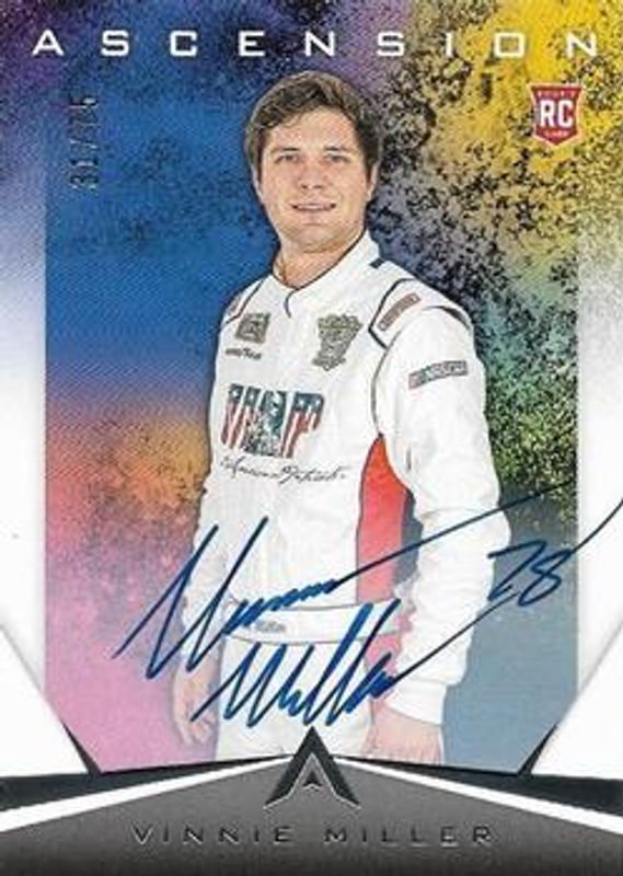 The Vinnie Miller 2020 Chronicles NASCAR #19 Ascension Autographs /199 card is 1 of 56 Vinnie Miller's card variations in the 2020 Chronicles NASCAR set being tracked by Sports Card Investor, including Base, Blue /199, Red /99, Purple /25, and Gold /10.