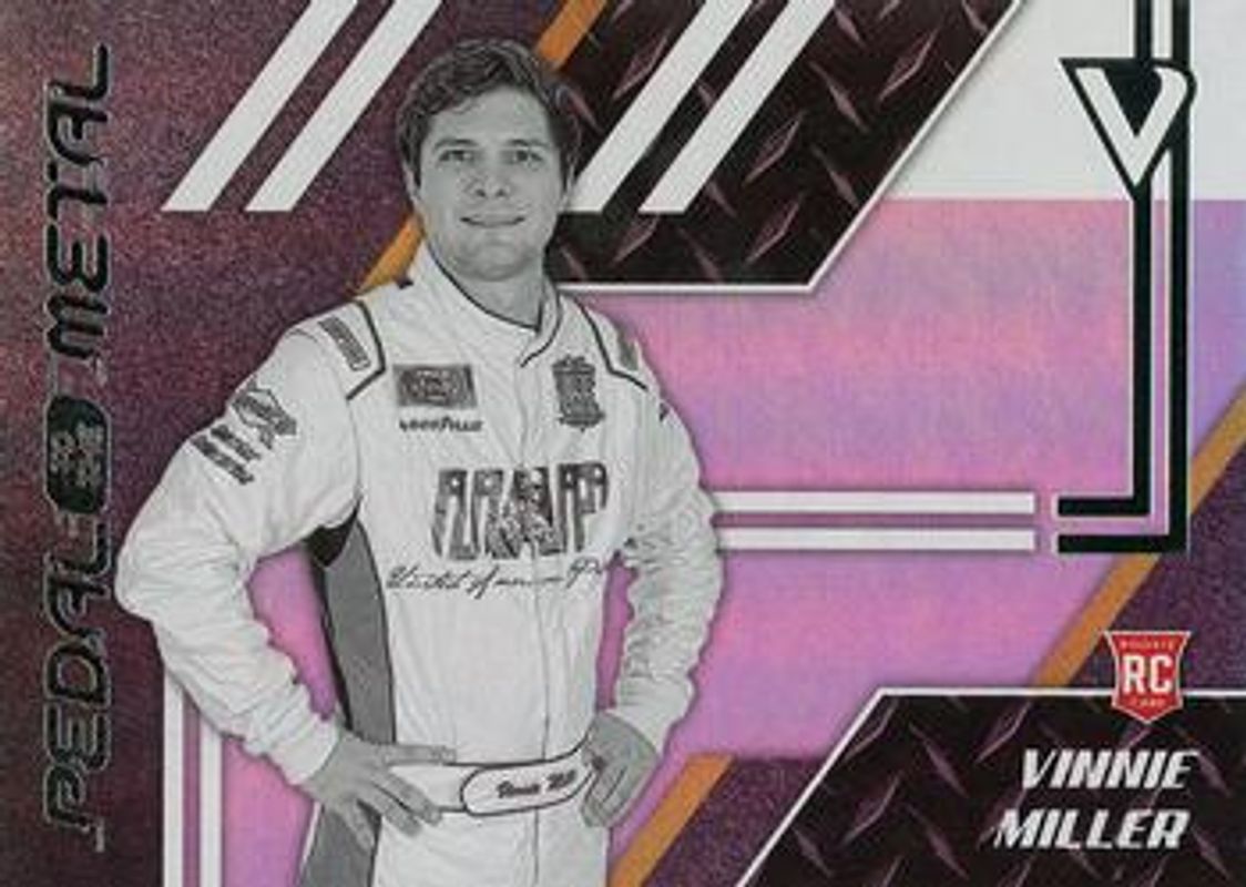 The Vinnie Miller 2020 Chronicles NASCAR #13 Pedal to the Metal card is 1 of 56 Vinnie Miller's card variations in the 2020 Chronicles NASCAR set being tracked by Sports Card Investor, including Base, Blue /199, Red /99, Purple /25, and Gold /10.