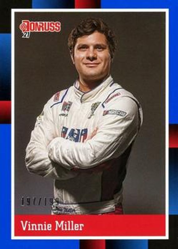 The Vinnie Miller 2021 Donruss NASCAR #190 Navy Blue /199 card is 1 of 42 Vinnie Miller's card variations in the 2021 Donruss NASCAR set being tracked by Sports Card Investor, including #190 Base, #103 Base, #103 Carolina Blue, #190 Carolina Blue, and #103 Orange.