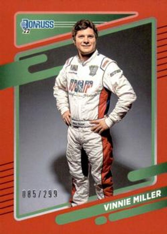 The Vinnie Miller 2022 Donruss NASCAR #89 Red /299 card is 1 of 21 Vinnie Miller's card variations in the 2022 Donruss NASCAR set being tracked by Sports Card Investor, including Base, Carolina Blue, Lime Green, Silver, and Navy Blue /199.