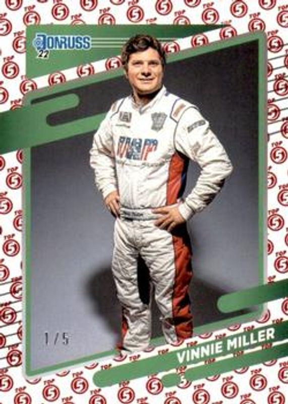 The Vinnie Miller 2022 Donruss NASCAR #89 Top 5 /5 card is 1 of 21 Vinnie Miller's card variations in the 2022 Donruss NASCAR set being tracked by Sports Card Investor, including Base, Carolina Blue, Lime Green, Silver, and Red /299.