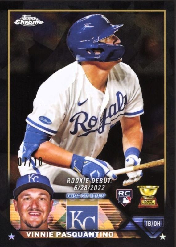 This card is 1 of 7 Vinnie Pasquantino's card variations in the 2023 Topps Chrome Update Sapphire Edition set being tracked by Sports Card Investor, including Rookie Debut, Rookie Debut - Gold /50, Rookie Debut - Orange /25, Rookie Debut - Red /5, and Rookie Debut - Padparadscha /1.