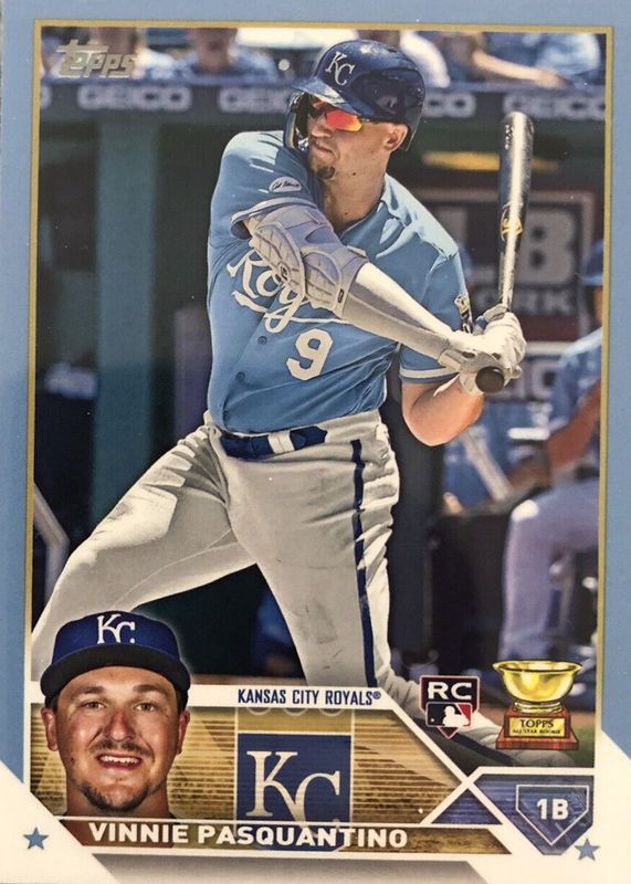 This card is 1 of 18 Vinnie Pasquantino's card variations in the 2023 Topps set being tracked by Sports Card Investor, including Base, Gold Foil, Rainbow Foil, Royal Blue, and Gold /2023.