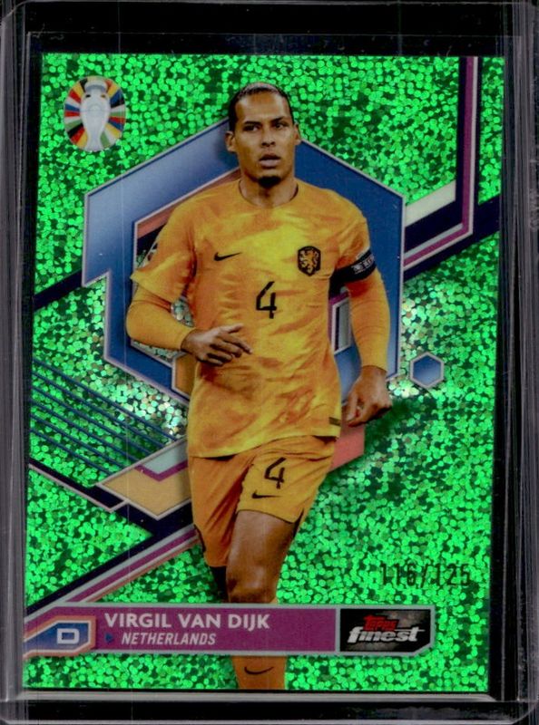 The Virgil van Dijk 2023 Topps Finest Road to UEFA Euro #54 Green Speckle Refractor /125 card is 1 of 26 Virgil van Dijk's card variations in the 2023 Topps Finest Road to UEFA Euro set being tracked by Sports Card Investor, including Base, Refractor, Blue Aqua Vaporwave Refractor /250, Blue Refractor /150, and Green Lava Refractor /99.