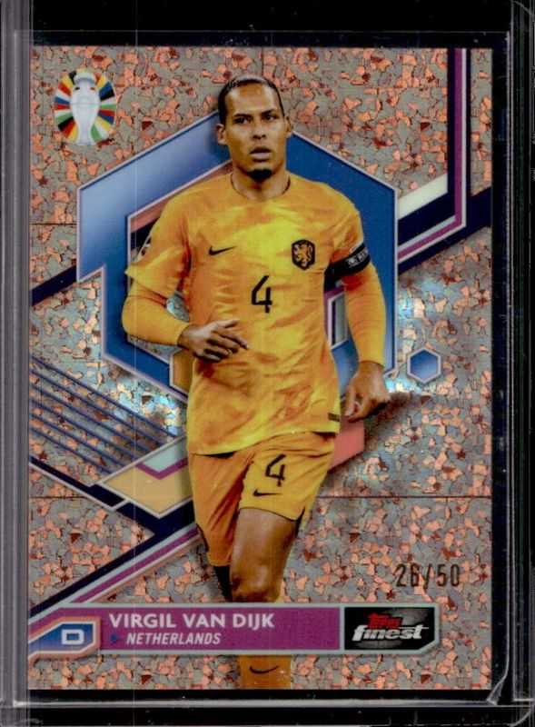The Virgil van Dijk 2023 Topps Finest Road to UEFA Euro #54 Rose Gold Mini Diamond Refractor /50 card is 1 of 26 Virgil van Dijk's card variations in the 2023 Topps Finest Road to UEFA Euro set being tracked by Sports Card Investor, including Base, Refractor, Blue Aqua Vaporwave Refractor /250, Blue Refractor /150, and Green Speckle Refractor /125.