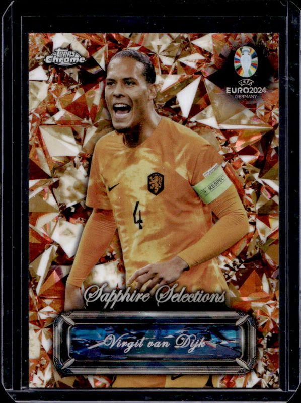 The Virgil van Dijk 2024 Topps Chrome Sapphire Edition UEFA Euro #SS-22 Sapphire Selections - Gold /50 card is 1 of 16 Virgil van Dijk's card variations in the 2024 Topps Chrome Sapphire Edition UEFA Euro set being tracked by Sports Card Investor, including Chrome, Chrome Autographs, Sapphire Selections, Chrome - Gold /50, and Chrome - Orange /25.