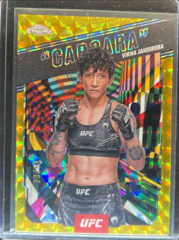 The Virna Jandiroba 2025 Topps Chrome UFC #AKA-5 AKA - Gold Geometric Refractor /50 card is 1 of 49 Virna Jandiroba's card variations in the 2025 Topps Chrome UFC set being tracked by Sports Card Investor, including Base, Geometric Refractor, Negative Refractor, Prism Refractor, and Purple Refractor.