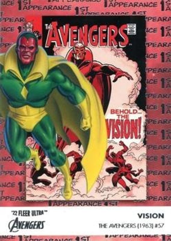 The Vision 2022 Fleer Ultra Avengers #FA-5 1st Appearances card is 1 of 53 Vision's card variations in the 2022 Fleer Ultra Avengers set being tracked by Sports Card Investor, including #114 Base, #83 Base, #83 Gold Rainbow Foil, #83 Green Foil, and #114 Green Foil.
