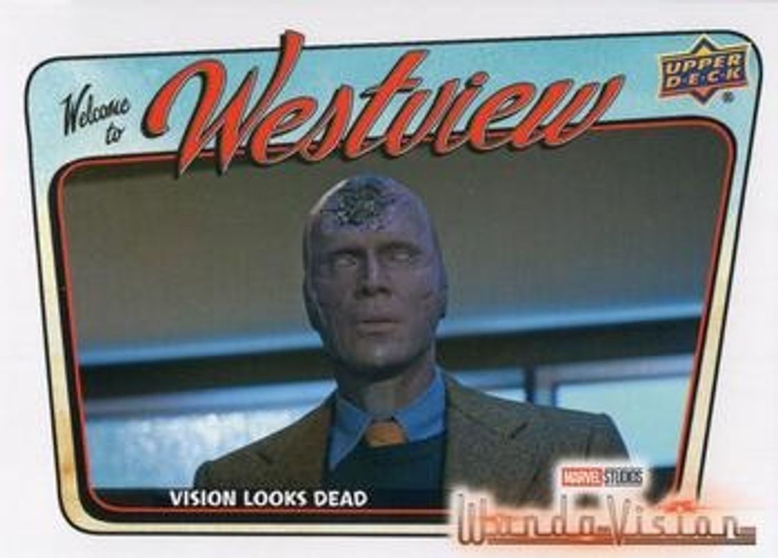 The Vision 2023 Upper Deck Wandavision #PR-15 Welcome to Westview card is 1 of 57 Vision's card variations in the 2023 Upper Deck Wandavision set being tracked by Sports Card Investor, including #72 Base, #16 Base, #72 Gold, #16 Gold, and #72 Mind Stone Yellow.