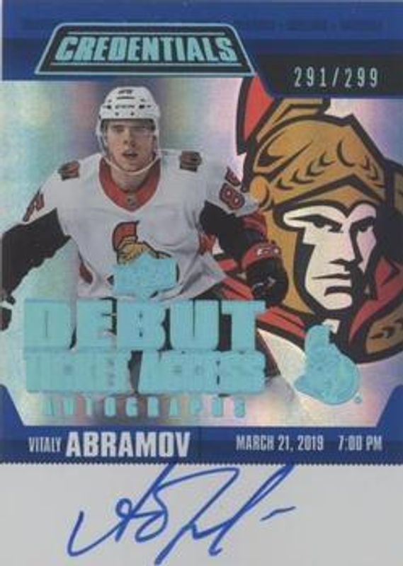 Vitaly Abramov 2019 Upper Deck Credentials #RTAA-VA Debut Ticket Access Autographs /299 Rookie RAW Price Guide