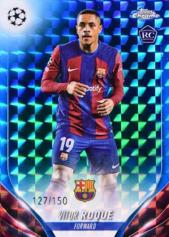 The Vitor Roque 2023 Topps Chrome UEFA Club Competitions #28 Blue Geometric Refractor /150 Rookie card in Raw condition has not changed in price in the last 30 days and was last sold for $2.25 .