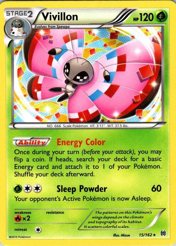 The Vivillon 2015 XY: BREAKthrough #015/162 Holo card in Raw TCG (Lightly Played) condition has moved up $0.45 (+30.0%) in the last 30 days and was last sold for $1.95 .