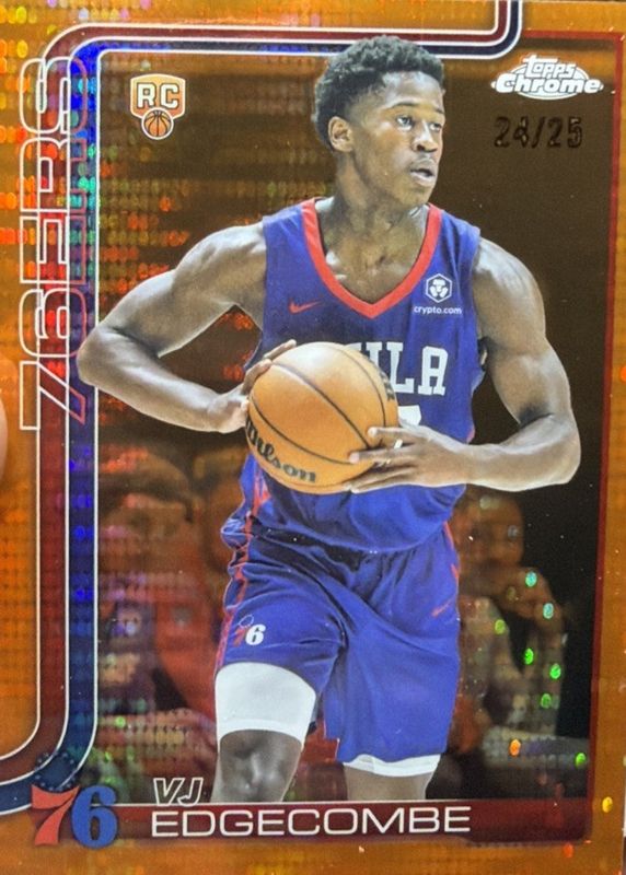 The VJ Edgecombe 2025 Topps Chrome #253 Orange Pulsar Refractor /25 Rookie card in Raw condition has moved up $154 (+22.8%) in the last 30 days and was last sold for $830.00 .