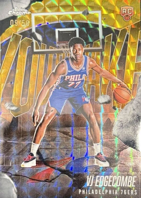 The VJ Edgecombe 2025 Topps Chrome #YQ-3 Youthquake - Gold Geometric Refractor /50 Rookie card in Raw condition has moved up $12.50 (+5.5%) in the last 30 days and was last sold for $240.00 .