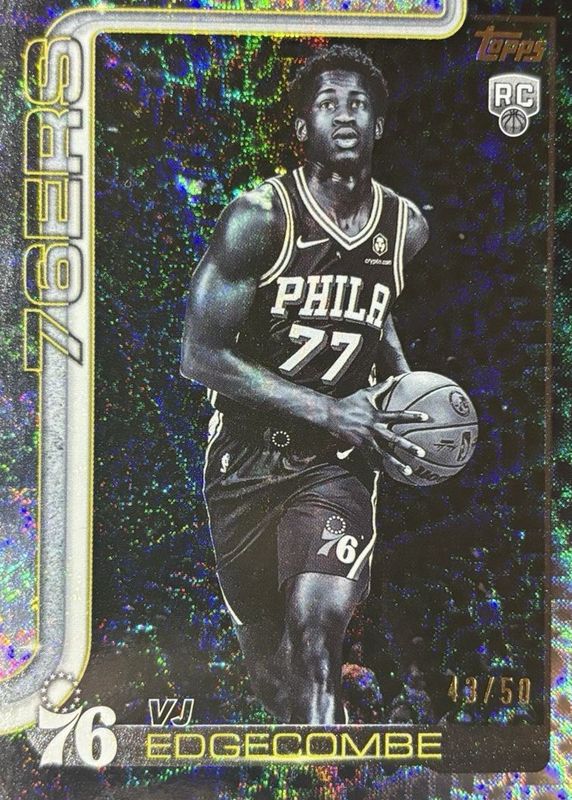 This card is 1 of 149 VJ Edgecombe's card variations in the 2025 Topps set being tracked by Sports Card Investor, including Base, Aqua Holo Foil, Blackout Variation, Blue Sandglitter, and Crackleboard Foil.