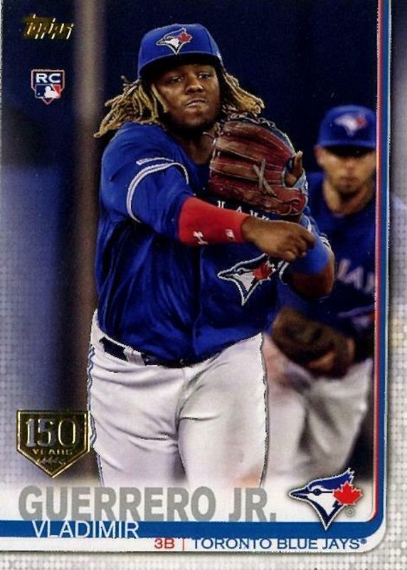 The Vladimir Guerrero Jr. 2019 Topps Update #US1 150th Anniversary (Throwing) Rookie card in Raw condition has moved up $2.95 (+148%) in the last 30 days and was last sold for $4.95 .