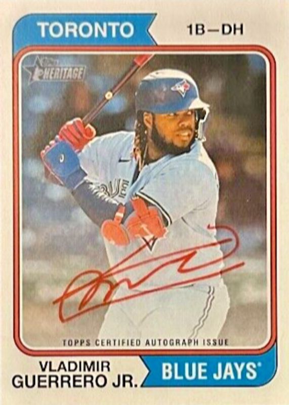 The Vladimir Guerrero Jr. 2023 Topps Heritage #ROA-VG Real One Autographs - Red Ink /74 card in Raw condition has not changed in price in the last 30 days and was last sold for $122.50 .