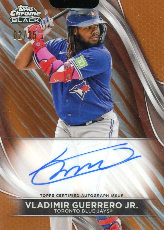 The Vladimir Guerrero Jr. 2024 Topps Chrome Black #CBA-VG Autographs - Orange Refractor /25 card in Raw condition has not changed in price in the last 30 days and was last sold for $70.00 .