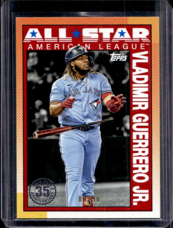 The Vladimir Guerrero Jr. 2025 Topps #90AS-49 1990 Baseball All-Star - The Real One /90 card is 1 of 109 Vladimir Guerrero Jr.'s card variations in the 2025 Topps set being tracked by Sports Card Investor, including #163 Player Number Variation (/27), #163 Rainbow Foil, #345 Sandglitter, #163 Sandglitter, and #345 Aqua Rainbow Foilboard.