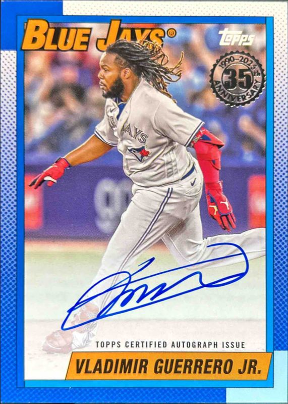 The Vladimir Guerrero Jr. 2025 Topps #90AU-VGJ 1990 Baseball Autographs (Series 1) card is 1 of 109 Vladimir Guerrero Jr.'s card variations in the 2025 Topps set being tracked by Sports Card Investor, including #163 Player Number Variation (/27), #163 Rainbow Foil, #345 Sandglitter, #163 Sandglitter, and #345 Aqua Rainbow Foilboard.