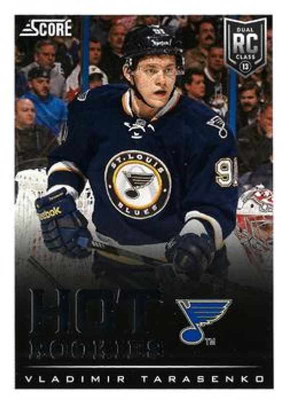 The Vladimir Tarasenko 2013 Score #647 Base Rookie card is 1 of 9 Vladimir Tarasenko's card variations in the 2013 Score set being tracked by Sports Card Investor, including Black, Gold, Red, Red Back, and First Goal.
