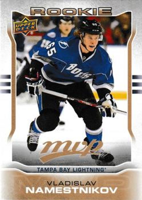 The Vladislav Namestnikov 2014 Upper Deck MVP #51 Base Rookie card is 1 of 9 Vladislav Namestnikov's card variations in the 2014 Upper Deck MVP set being tracked by Sports Card Investor, including Colors & Contours, Silver Script, Gold Script /100, Super Script /25, and Printing Plates Black /1.