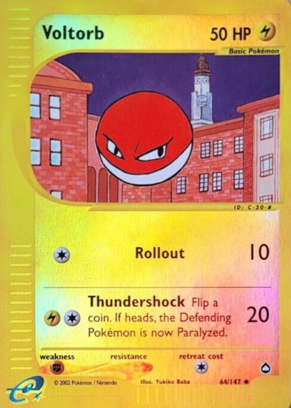 The Voltorb 2003 Aquapolis #064/147 Reverse Holo card in Raw TCG (Near Mint) condition has moved down -$0.24 (-1.0%) in the last 30 days and was last sold for $24.77 .