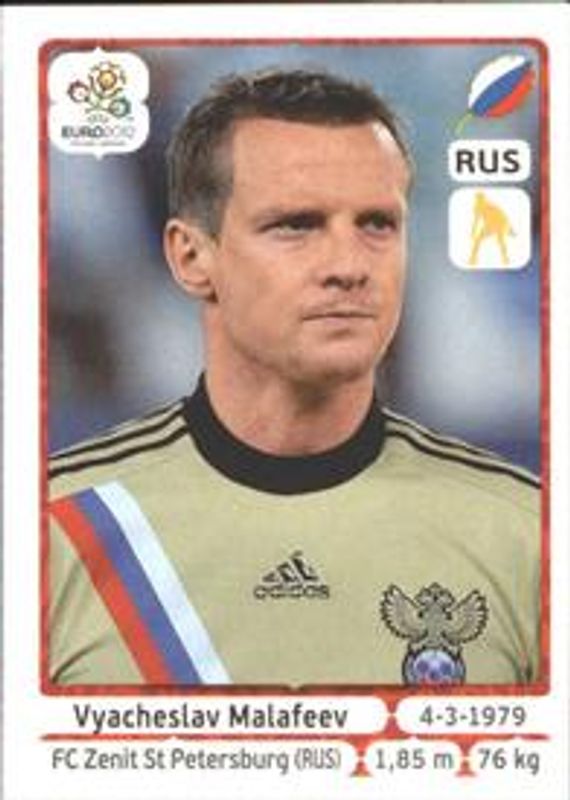 The Vyacheslav Malafeev 2012 UEFA Euro Stickers #114 Base card is 1 of 2 Vyacheslav Malafeev's card variations in the 2012 UEFA Euro Stickers set being tracked by Sports Card Investor, including German.
