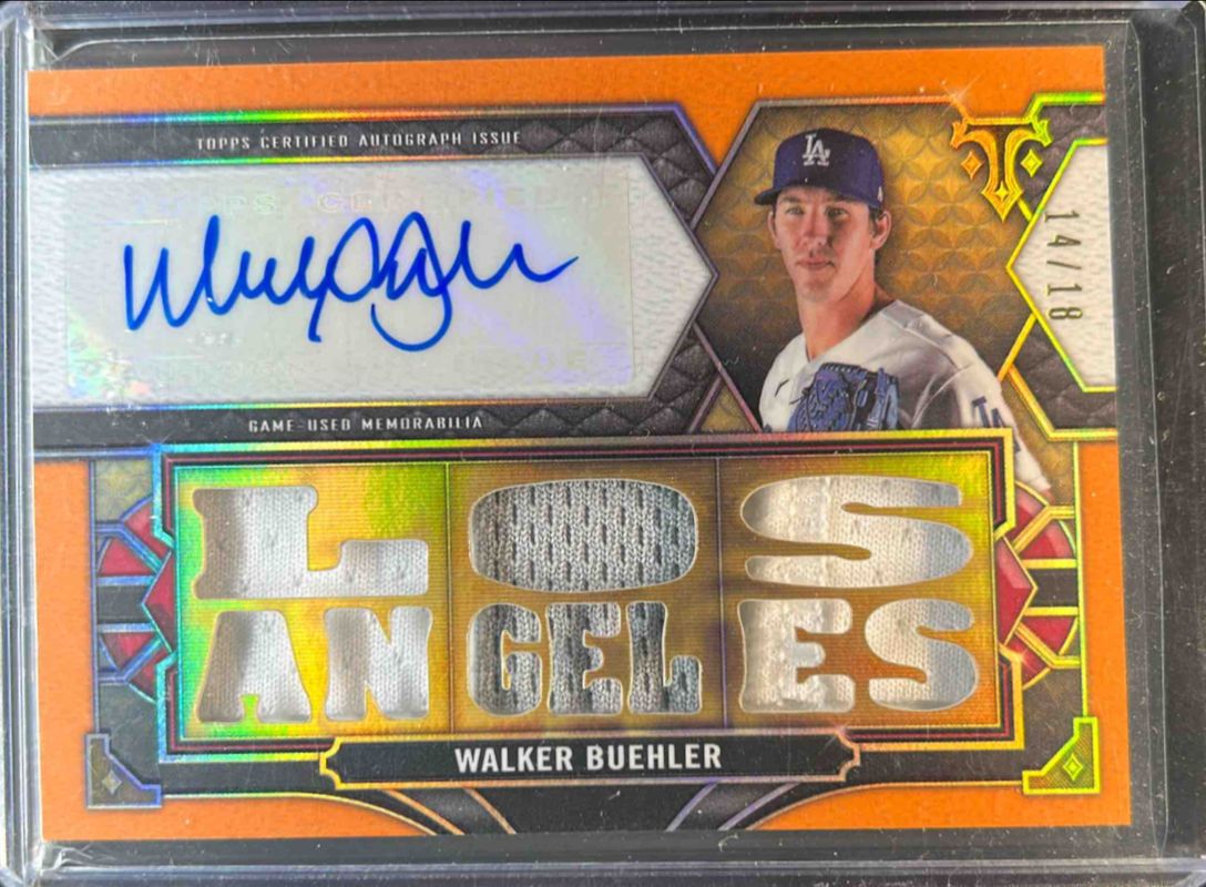 The Walker Buehler 2022 Topps Triple Threads #TTAR-WB1 Autographs Relic - Amber /18 card is 1 of 87 Walker Buehler's card variations in the 2022 Topps Triple Threads set being tracked by Sports Card Investor, including #SJR2-WB1 Single Jumbo Relics /48, #SJR2-WB2 Single Jumbo Relics /48, #TTR-WB4 Relics /36, #TTR-WB Relics /36, and #TTR-WB2 Relics /36.
