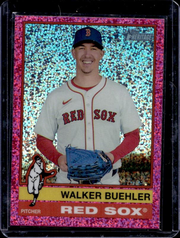 The Walker Buehler 2025 Topps Heritage #416 Chrome - Pink Sparkle Refractor card is 1 of 24 Walker Buehler's card variations in the 2025 Topps Heritage set being tracked by Sports Card Investor, including Base, Black Border, Dark Blue Border, Dark Green Border, and Dark Yellow Border.