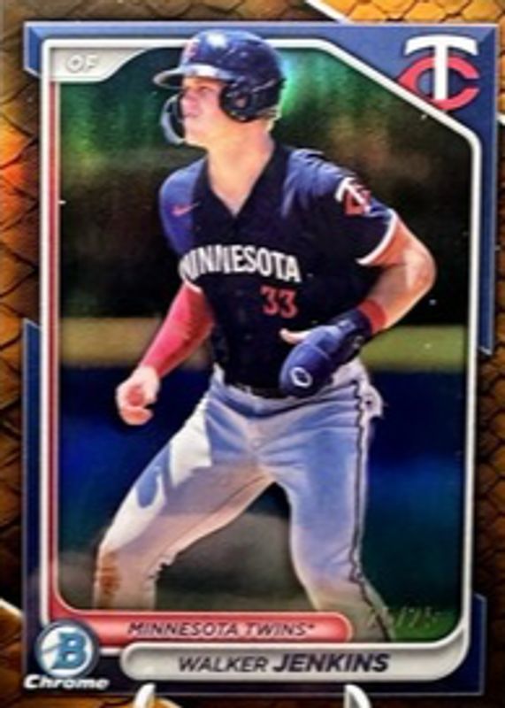 The Walker Jenkins 2024 Bowman Chrome #BCP-204 Prospects - Reptilian Orange Refractor /25 card in Raw condition has not changed in price in the last 30 days and was last sold for $99.00 .