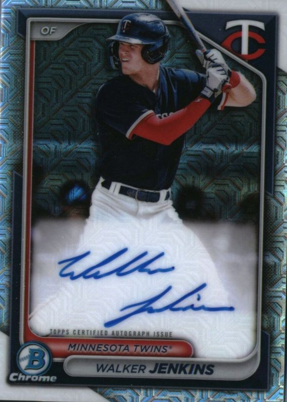 The Walker Jenkins 2024 Bowman Mega Box #BMA-WJ Chrome Prospect Auto card in Raw condition has not changed in price in the last 30 days and was last sold for $160.00 .