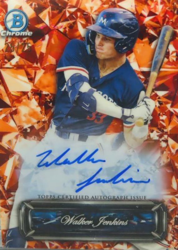 The Walker Jenkins 2024 Bowman Sapphire Edition #SSA-WJ Sapphire Selections Autographs - Orange /25 card in Raw condition has not changed in price in the last 30 days and was last sold for $199.50 .