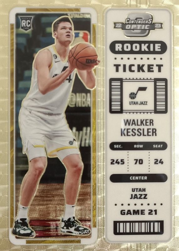 The Walker Kessler 2022 Contenders Optic #1 Gold Vinyl /1 Rookie card in Raw condition has not changed in price in the last 30 days and was last sold for $330.00 .