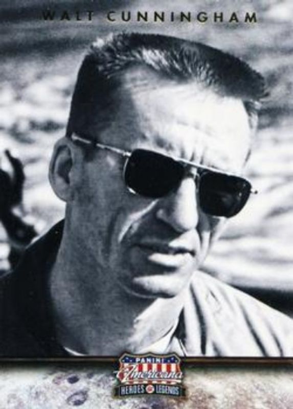 The Walt Cunningham 2012 Panini Americana Heroes & Legends #124 Base card is 1 of 13 Walt Cunningham's card variations in the 2012 Panini Americana Heroes & Legends set being tracked by Sports Card Investor, including Elite Signatures /165, Bronze Proof /100, Elite Materials Bronze Proof /99, Gold Proof /50, and Silver Proof /50.