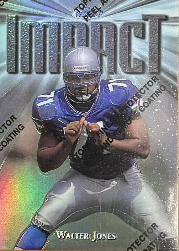 Walter Jones' Football cards are available in at least 12 sets. Walter Jones' biggest 7-day price movers are 1997 Topps Finest #282 Silver - Refractor, 1997 SP Authentic #6 Base, and 1997 Topps Finest #282 Silver - Embossed.