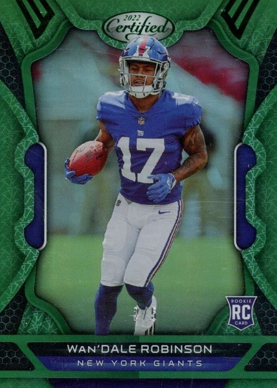 This card is 1 of 17 Wan'Dale Robinson's card variations in the 2022 Certified set being tracked by Sports Card Investor, including Base Rookie /399, Mirror /325, Mirror Bronze /275, Mirror Pink /199, and Mirror Orange /149.