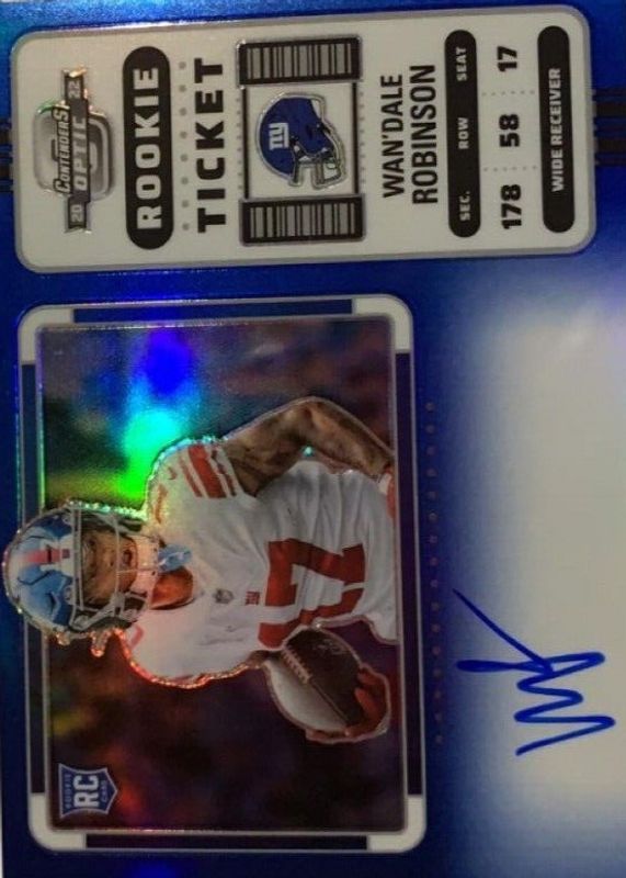The Wan'Dale Robinson 2022 Contenders Optic #141 Rookie Ticket Auto Variation - Blue /25 card in Raw condition has not changed in price in the last 30 days and was last sold for $13.50 .