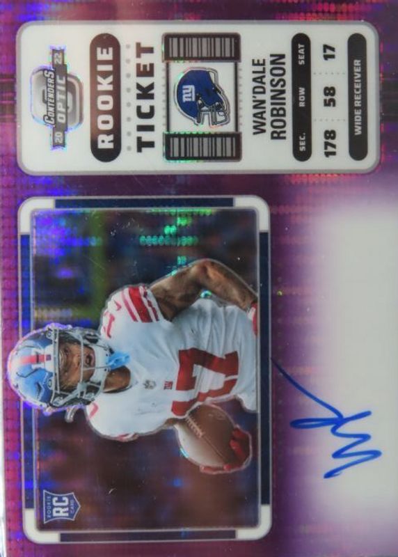 Auctions Ending Soon for Wan'Dale Robinson 2022 Contenders Optic #141 Rookie Ticket Auto Variation - Purple Pulsar /21 RAW